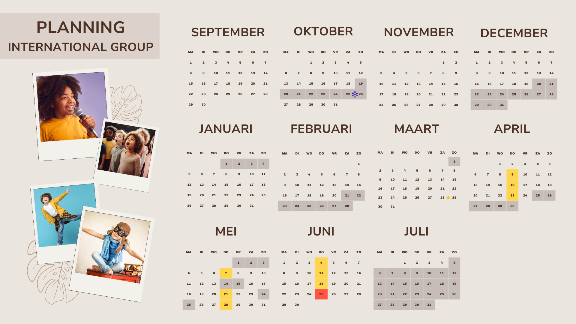 Below you'll find our annual schedule. This can be adjusted throughout the year based on the content of the year. In May and June we will have an extra rehearsal for groups B and C on Saturday or Sunday afternoon. Group A will only join the extra rehearsal in June.